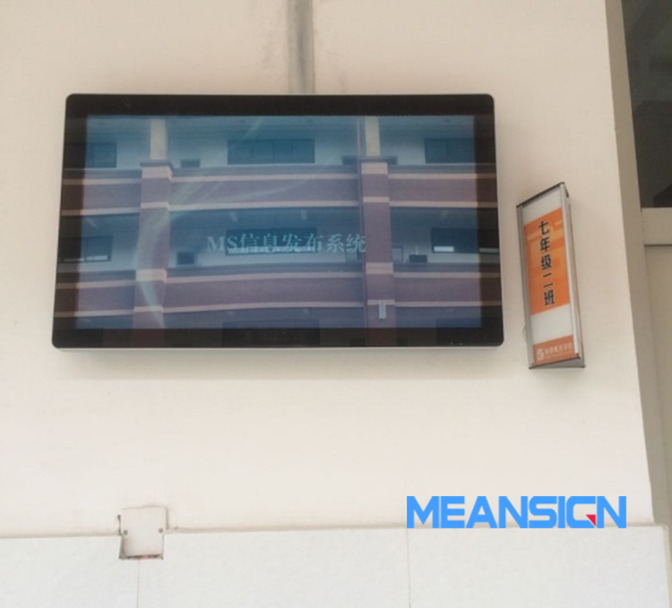 在教學樓每個班級教室門口,安裝電子班牌顯示屏,展示班級名稱、班級課程安排、任課老師、值日表、班級照片、班級活動、班級文化、師生風采、班級榮譽、校園通知、校園新聞、各種評比活動,還可以展示一些公共信息如:天氣、日期時間,支持文字、圖片、音視頻樣式。